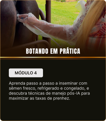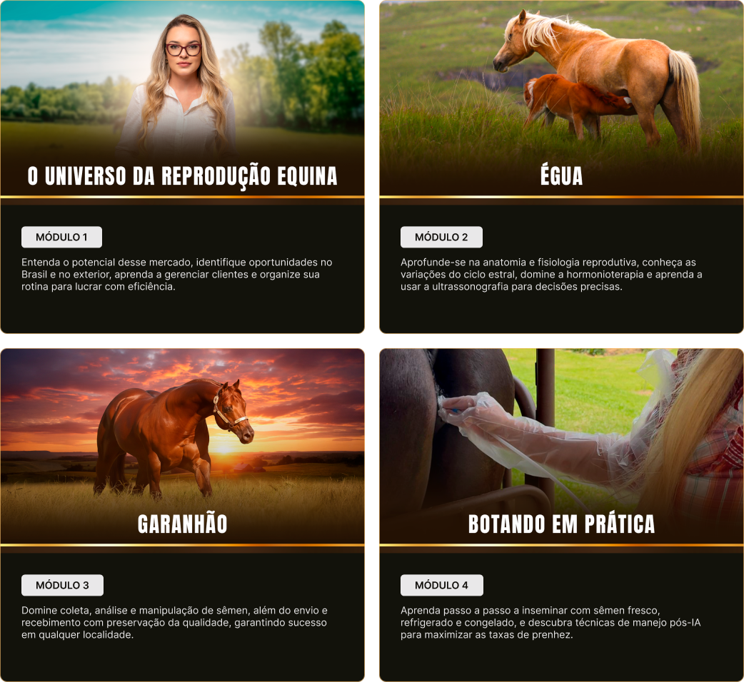 No Brasil, já orientou mais de 100 alunos e atendeu mais de 1.000 éguas, sempre com um método que une técnica apurada, tomada de decisão estratégica e aplicação prática. Sua didática é reconhecida por transformar conhecimento complexo em prática simples e eficaz, formando profissionais prontos para atuar com segurança em qualquer cenário.